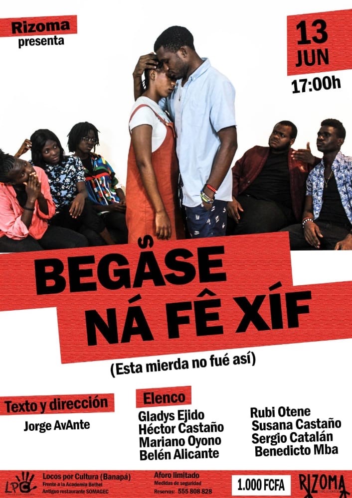 Rizoma, que es definido por su director (Jorge Avante) como “un proyecto de teatro comunitario”, además de nuevo, es diferente y semejante a los anteriores. Diferente porque, sus funciones reúnen a ecuatoguineanos y europeos por igual, (aunque luego se queden separados en grupos de blancos y negros o, según Luna, en grupos de gente que se conoce entre sí); también es el único grupo en Guinea Ecuatorial que está dirigido por un joven casi punk de piel blanca y padres españoles (en realidad, Jorge no es español ni ha sido blanco o negro durante su estancia en Guinea Ecuatorial. Él no es un color. Sólo le ha faltado beber el agua del grifo como todos nosotros, lástima que le de diarrea); Rizoma tampoco ha incorporado el canto en sus representaciones que por ahora no superan la hora; esta brevedad siempre me ha dejado con la sensación de que falta una segunda parte.